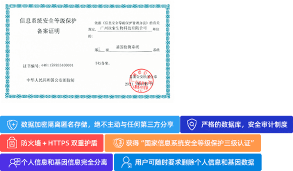 基因宝对每一位用户的承诺:您的数据绝不主动与任何第三方分享。获得“国家信息系统安全等级保护三级认证”,信息安全方面取得三级等保认证,受国家信息安全监管部门监督检查。